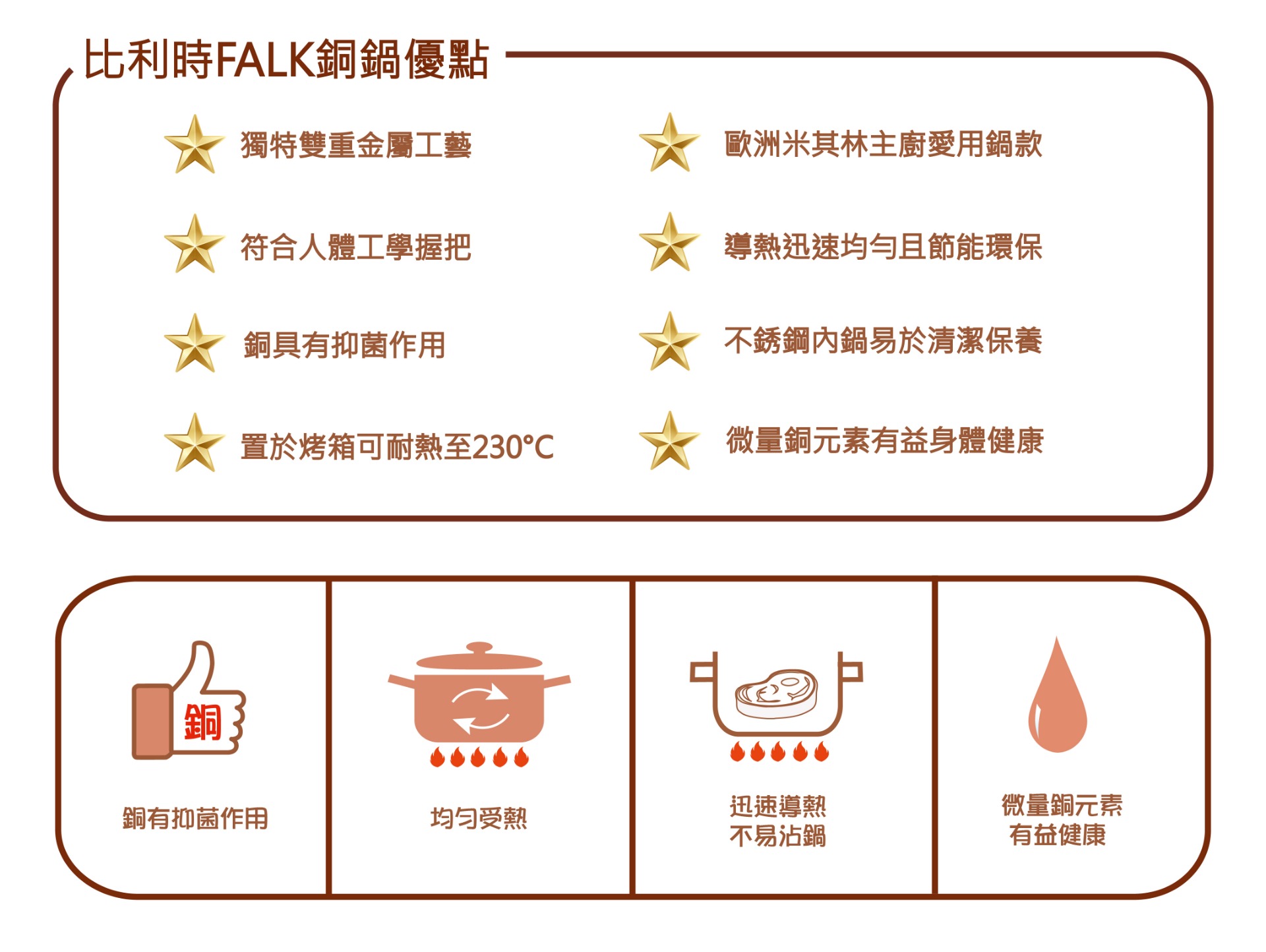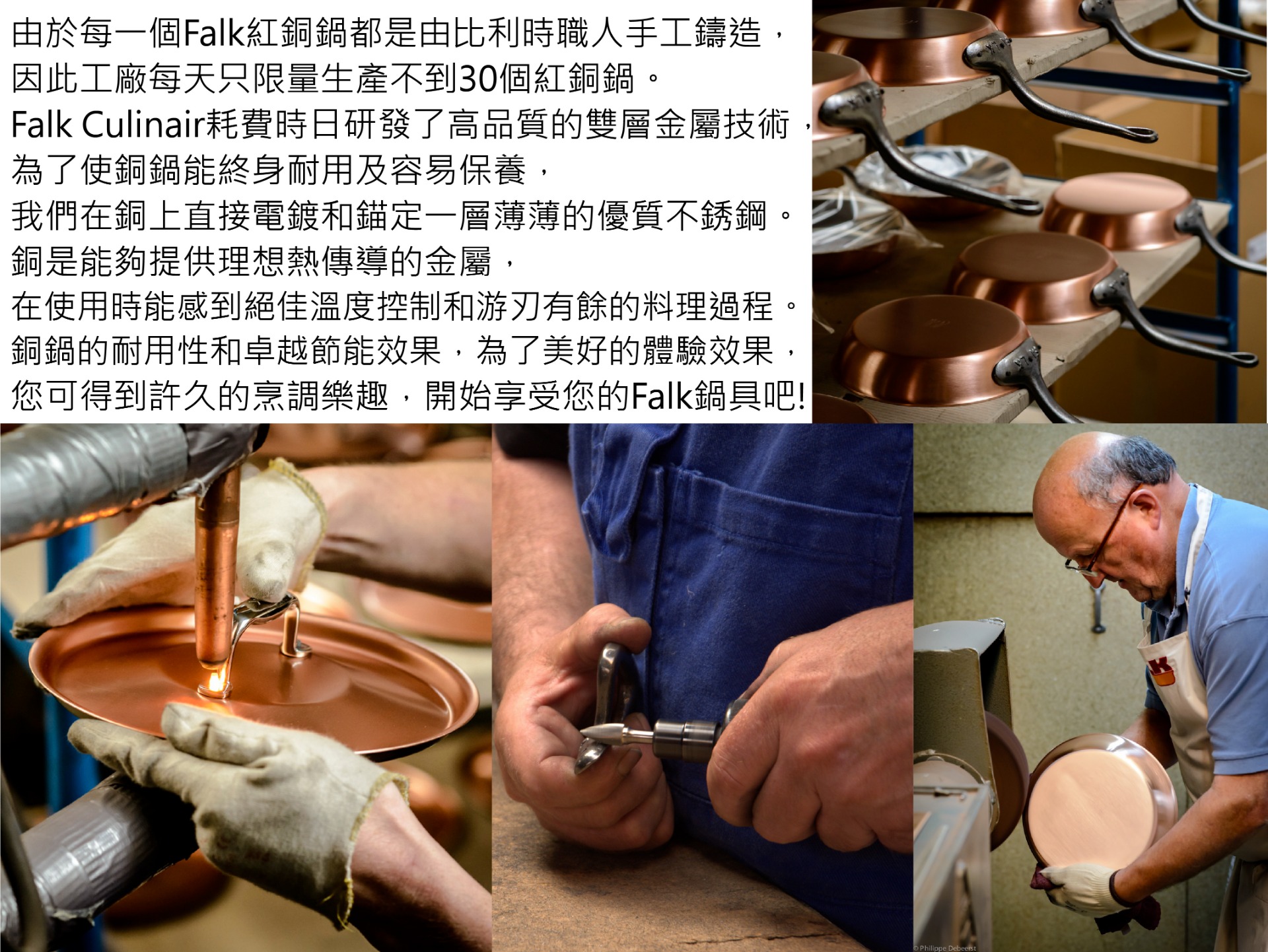 此技術稱為intercrystallisation將2.3mm的純銅和0.2mm的18/8不銹鋼完美結合, 使FALK銅鍋兼具了銅的快速導熱性及不銹鋼烹飪的優點。
